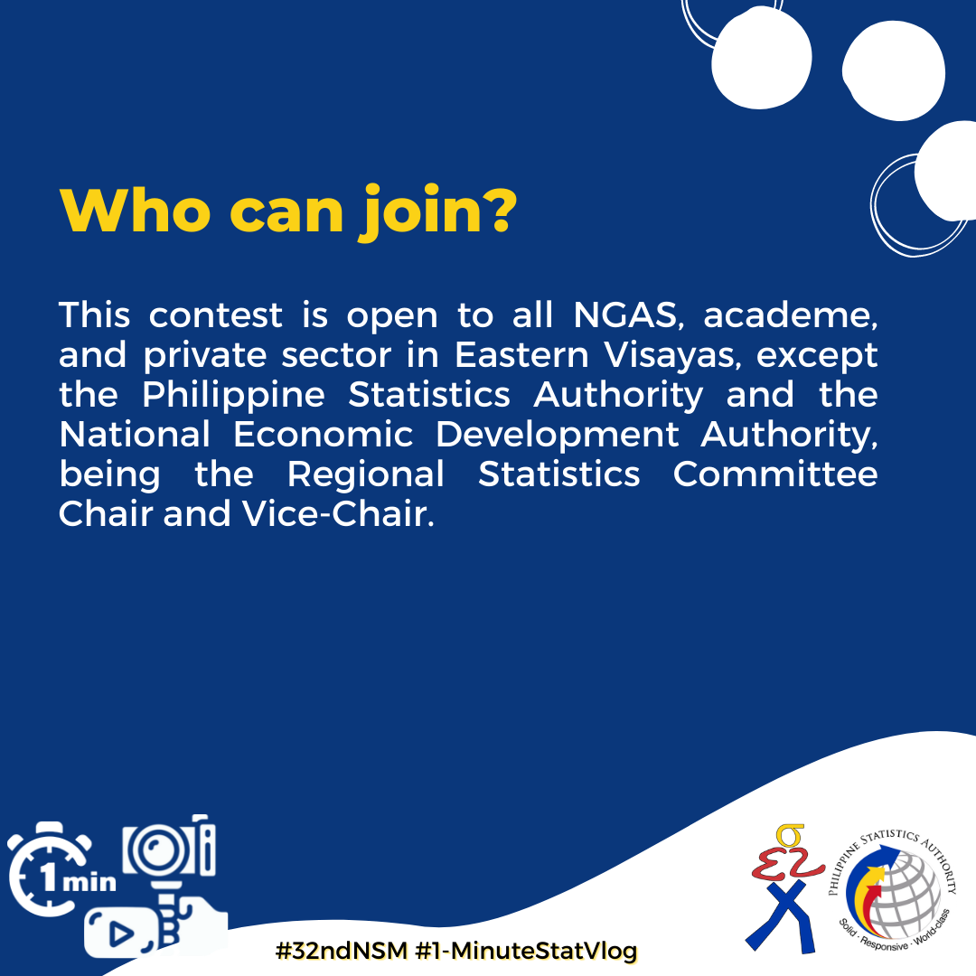 The Philippine Statistics Authority-Regional Statistical Services Office 8 (PSA – RSSO đ will hold a 1-Minute Stat Vlog Contest as part of the 32nd National Statistics Month Celebration this October. It is a vlog (video blog) making contest that aims to create a powerful story around the 32nd NSM theme âNSM@32: Revving up for Economic and Social Recovery Through Evidence-Based Policiesâ in just a minute. All entries will serve as promotional videos to increase awareness of the month-long NSM celebration and the importance of statistics in the governmentâs economic and social recovery plans and programs. This activity also aims to enjoin the National Government Agencies (NGAs), academe, and private sector to participate in this nationwide annual undertaking, and to amplify the social and economic recovery efforts of the different agencies/sectors.