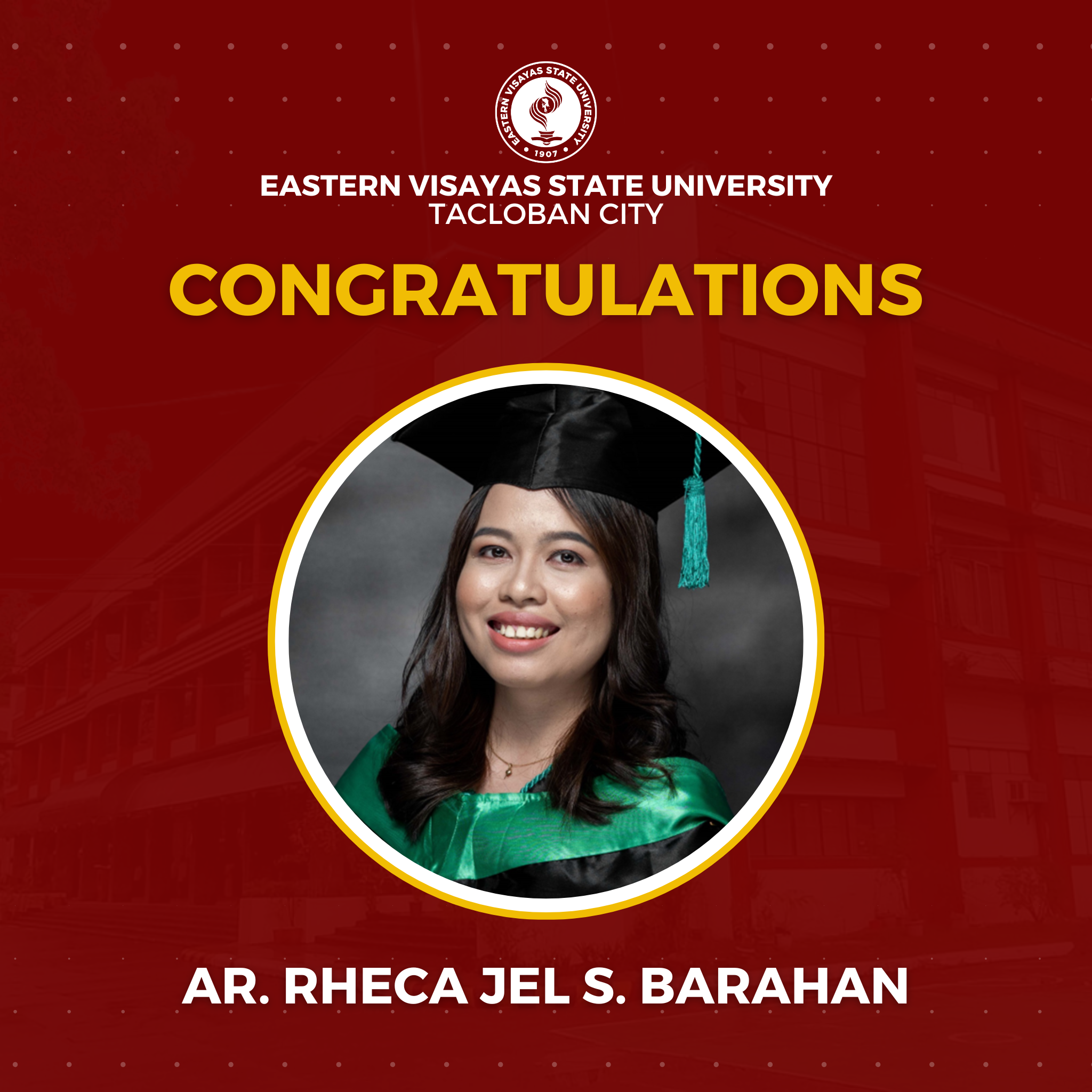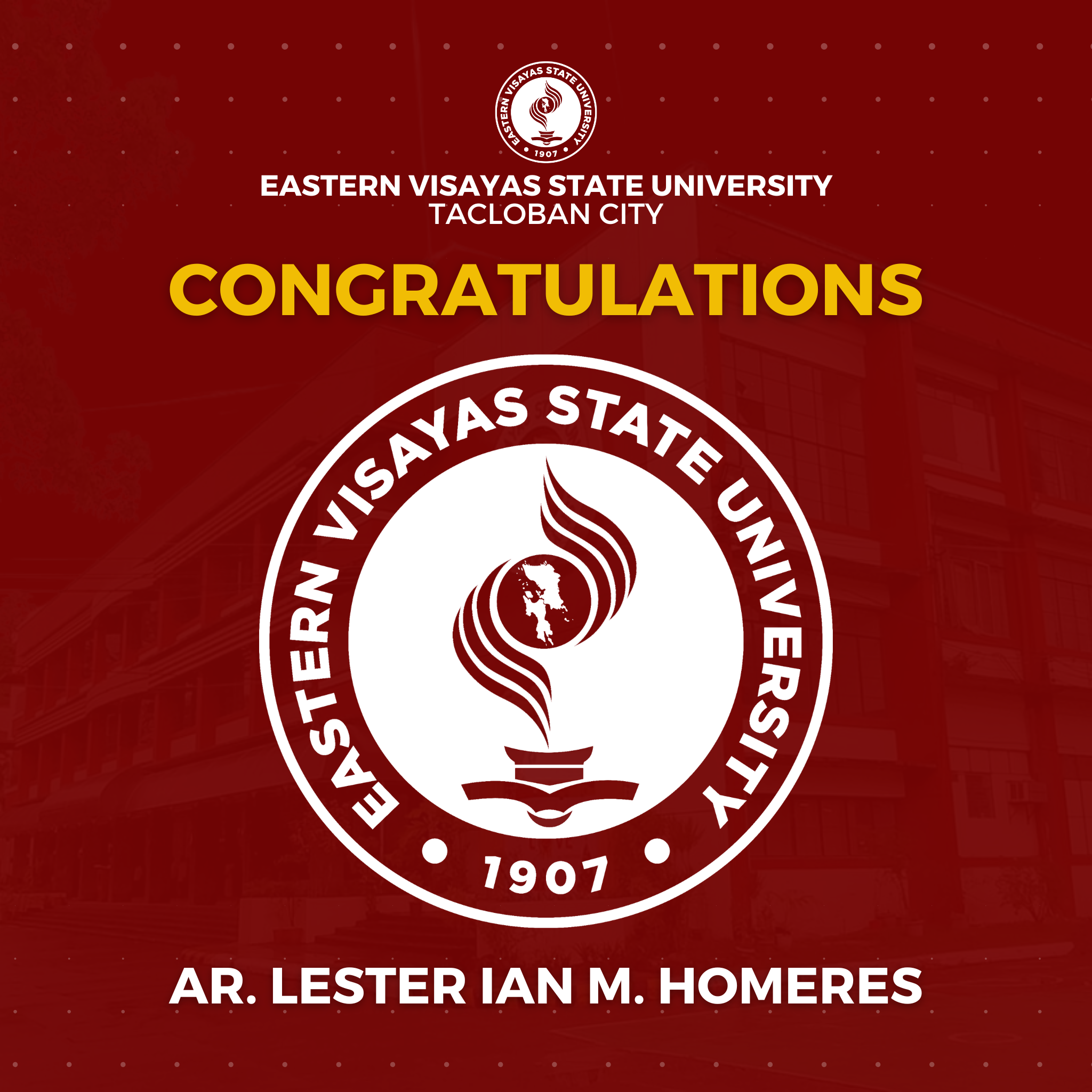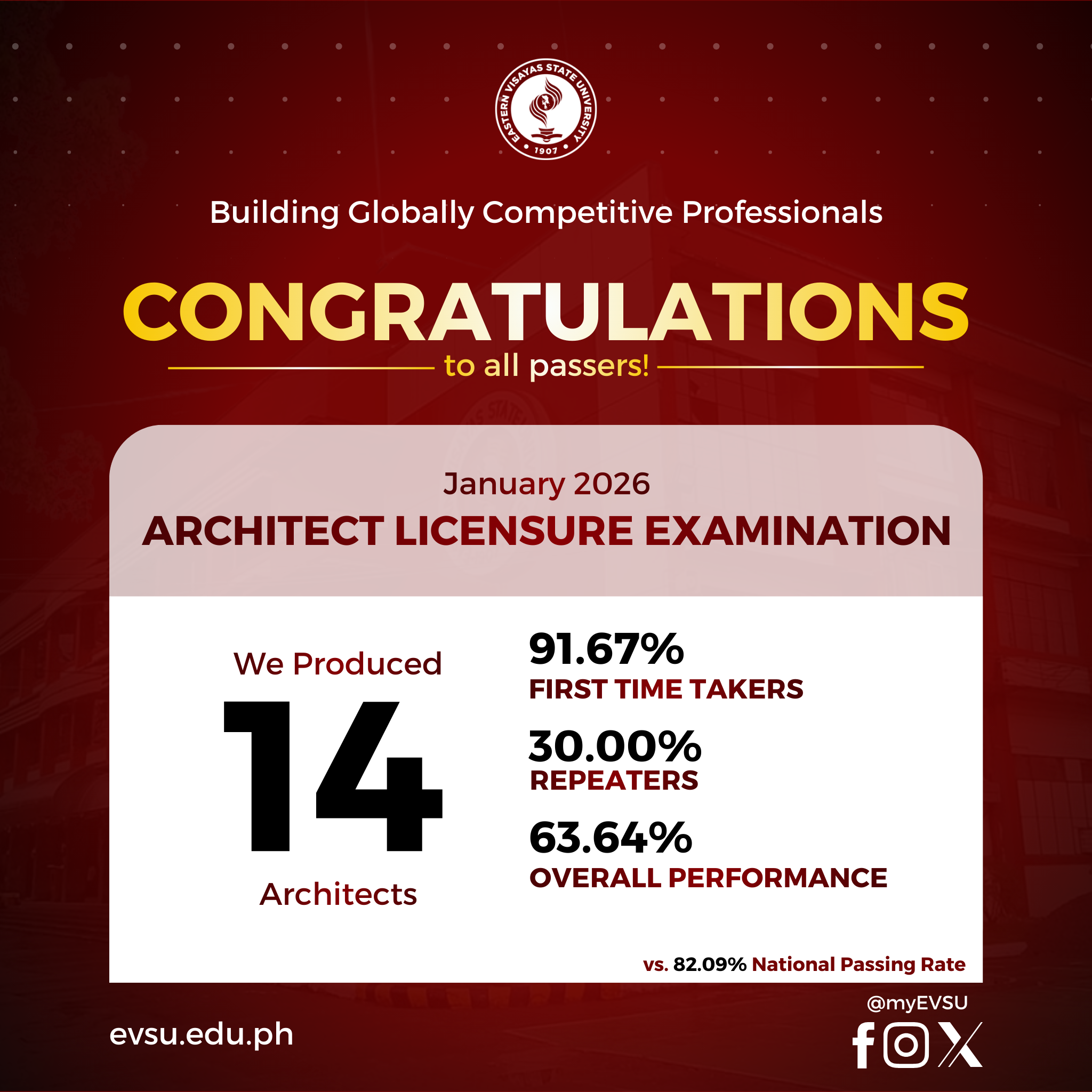 The Eastern Visayas State University (EVSU) has proudly produced 14 new architects in the January 2026 Architect Licensure Examination (ALE). The university reported a 63.84% passing rate: with a 91.67% passing rate for first time takers (11 passers) and 30.00% passing rate for repeaters (3 passers).